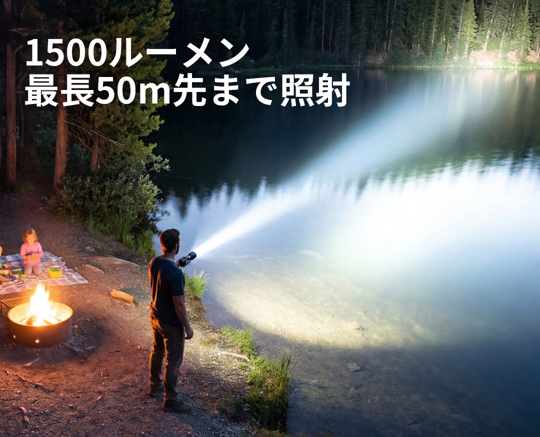 T1は、1500ルーメンの高出力LEDを搭載し、50メートル先までを鮮明に照らし出します。 暗闇の中でも、周囲の状況を把握し、