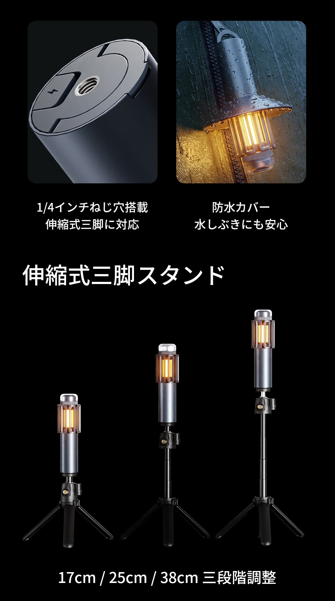 吊り下げ式デザインでテントや木の枝に吊るして使えるほか、 17cm・25cm・38cmの3段階で高さ調整ができる伸縮三脚を使えば、テーブルにも地面にも柔軟に設置できます。