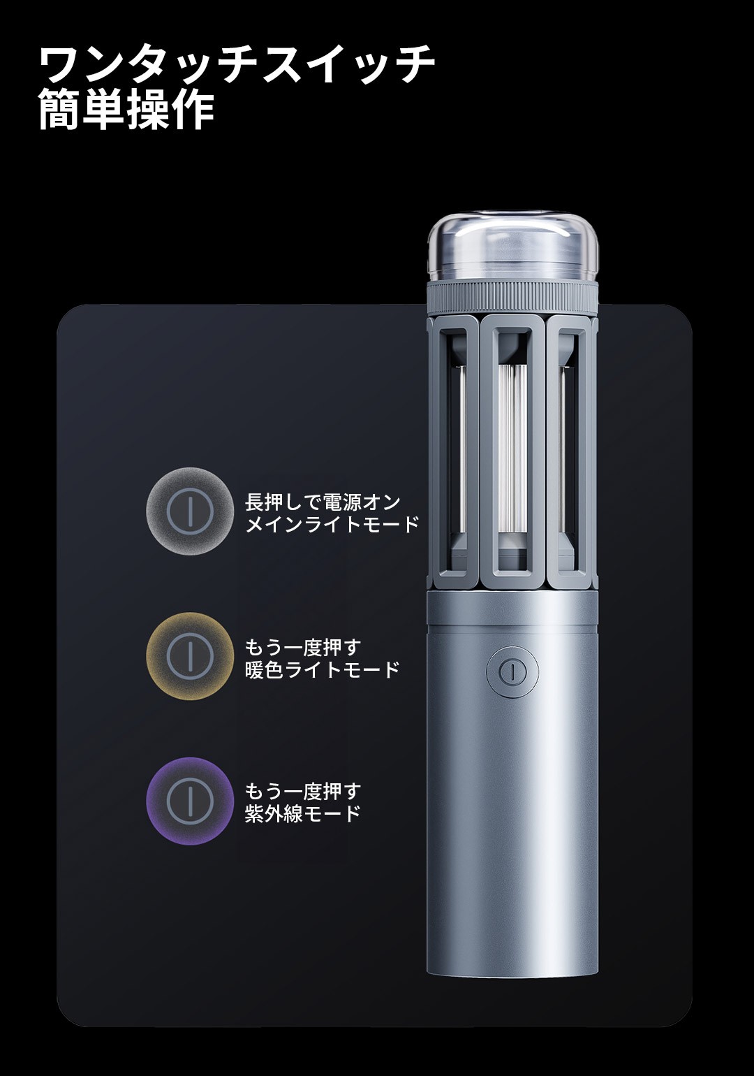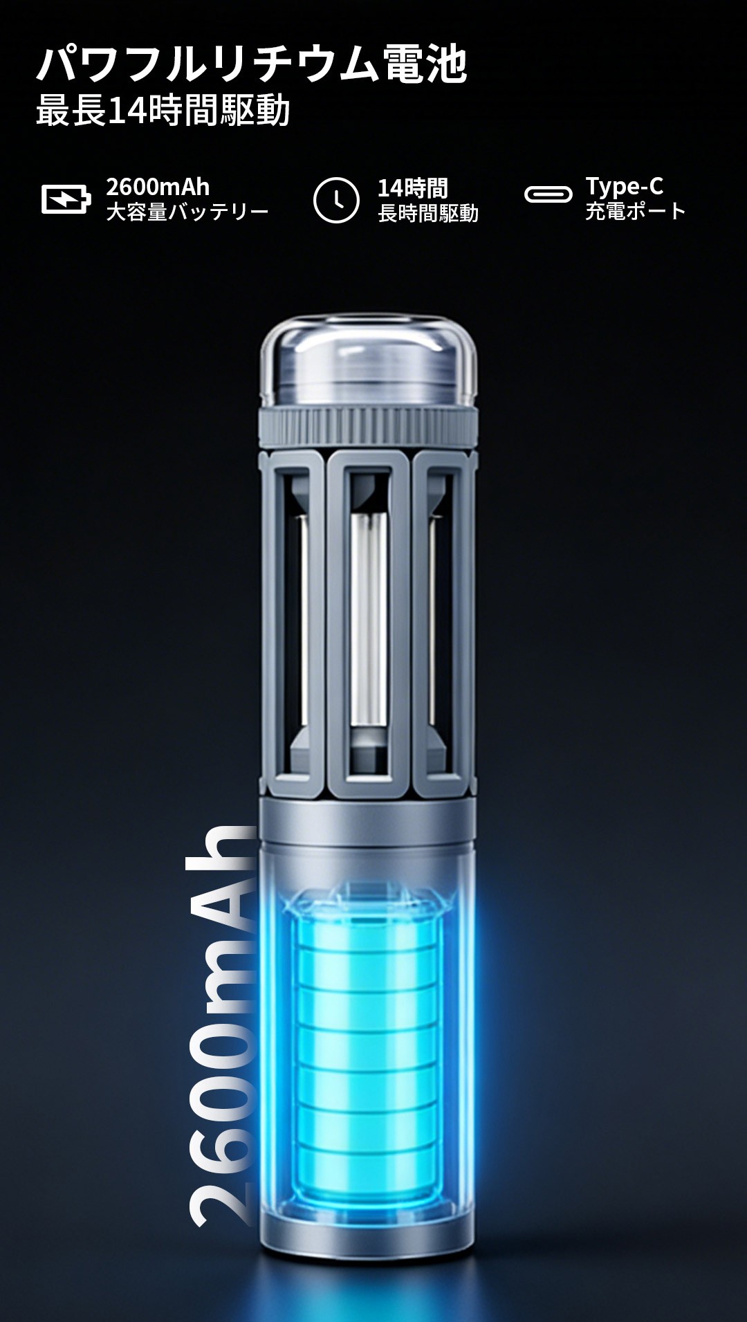2600mAhの大容量リチウム電池を搭載し、最大14時間の連続駆動を実現。ワンボタンで直感的にモードを切り替えられ、
